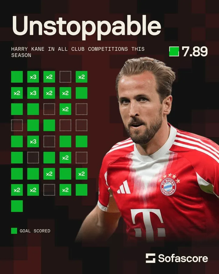 根据Sofascore的统计,哈里-凯恩本赛季代表拜仁41次出场打进49球,在这41场比赛中仅有10场未能进球,而且从未有过连续三场不进球的情况。